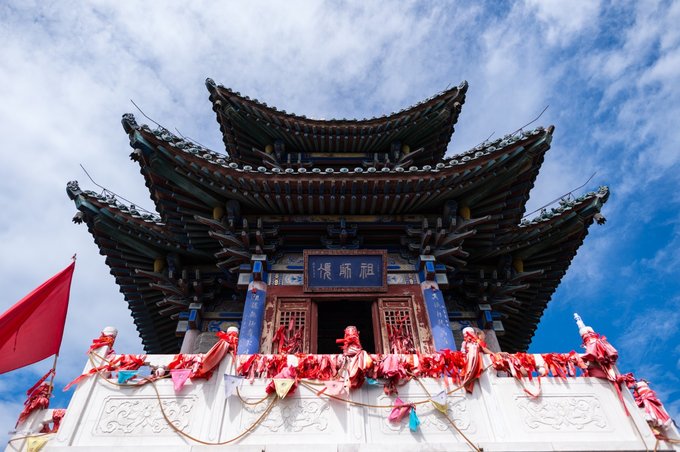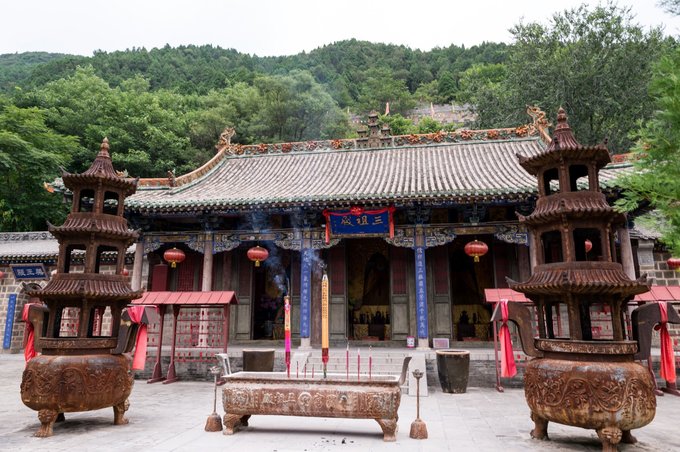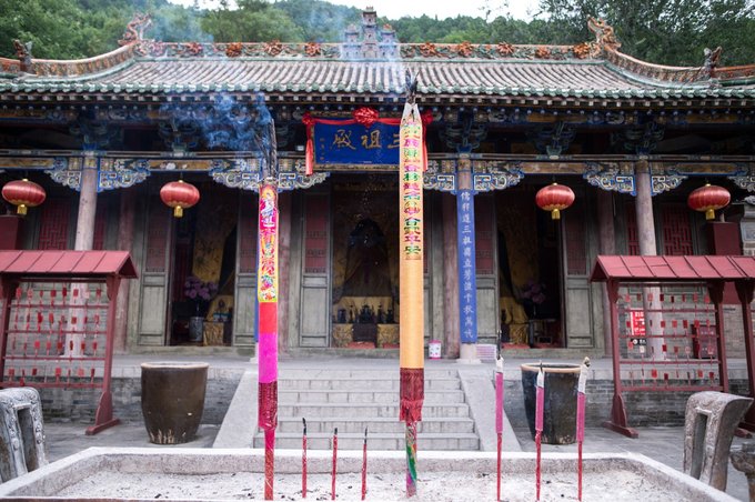 祖师顶,云丘山的第二高峰,位于神龙岭之上,海拔1330米,其上位玉皇顶,下连三天门,群山环绕,风水极佳。被祖师真武大帝选为道场,历经42年修炼,功德圆满,羽化升天,玉皇大帝封为太玄,镇于北方。 真武大帝为道教北极四圣之一,为道教神仙中赫赫有名的玉京尊神。后世人们为了纪念祖师修炼成仙在山顶修建了祖师殿,也就是今天我们要去的目的地,建于山顶的一座元代重檐十字歇山顶式建筑。