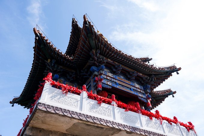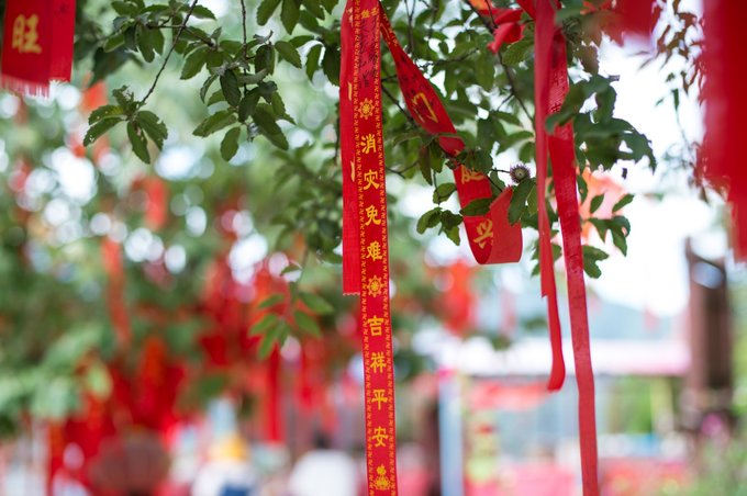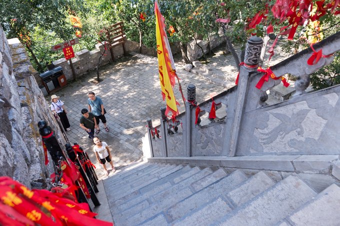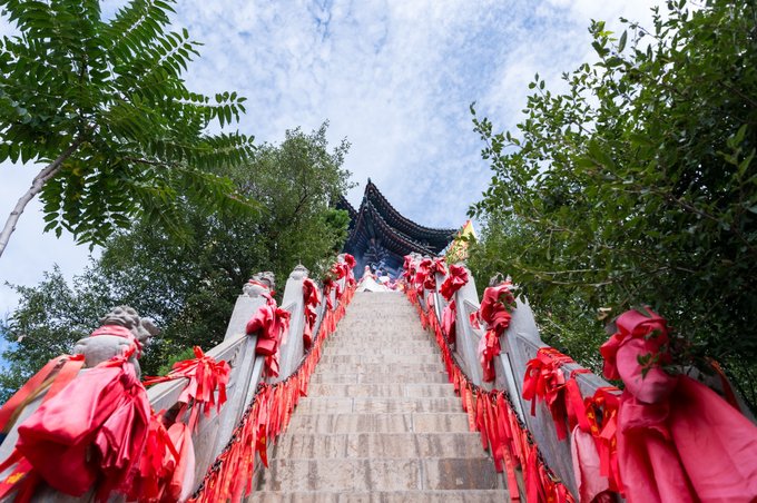 玉皇阁四周为汉白玉围栏所围,来这里祈福祭祀的人把祝愿寄托于红布条之上,系在汉白玉围栏之上,也是对生活的一份祈盼和寄托。