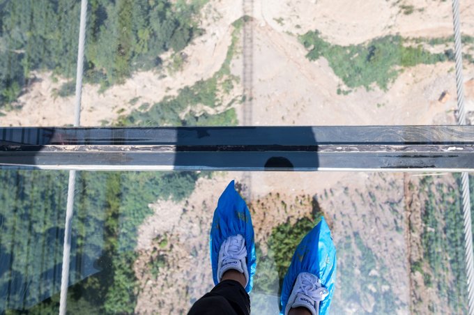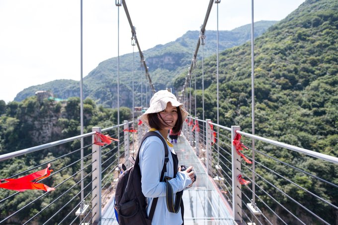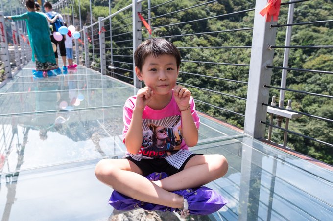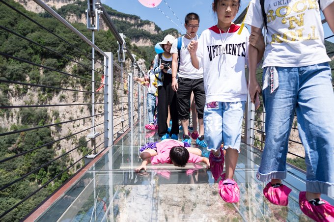 当然也有一些人是这样子的,一屁股坐在桥上,一手挡着眼睛,一手抓着围栏,不论男朋友怎么拉,就是不走!其实是不敢走!不知道,你们怕不怕走玻璃桥?欢迎分享你体验玻璃桥的经历。