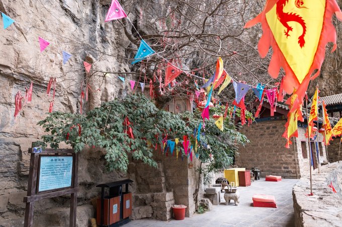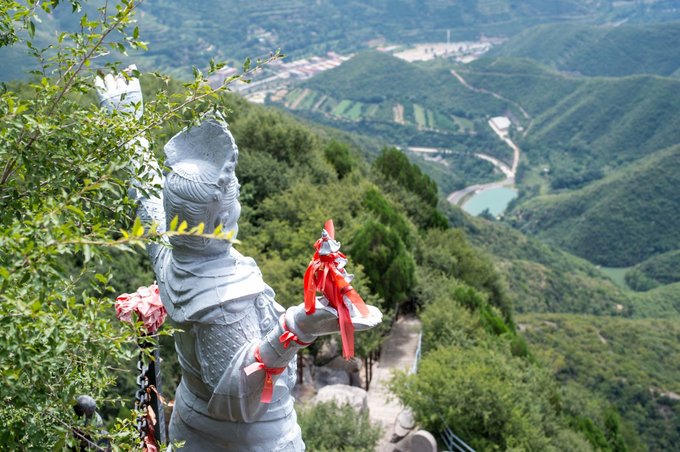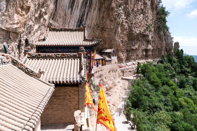 由于凹陷处较窄,为了让建筑整体更宽阔,所以在峭壁外使用了木柱进行支撑,这个于恒山悬空寺相似,看起来巍峨壮观,走在上面还有点吓人,也不禁让人感叹云丘山的神奇,不愧是一座道教名山。