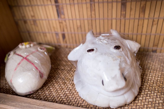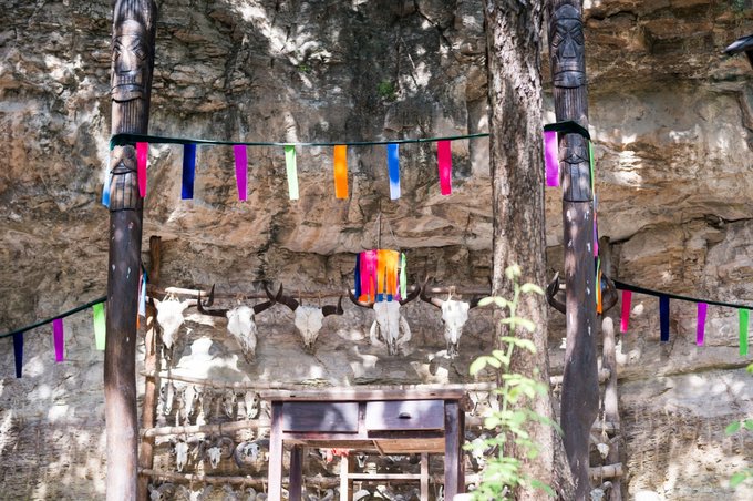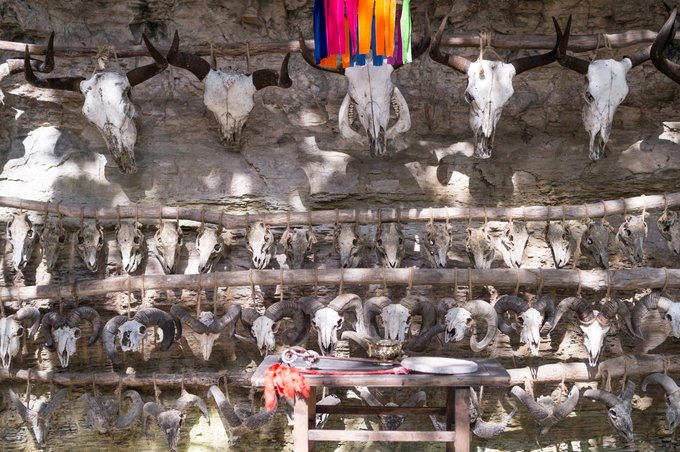 在院落的一面崖壁上竟然挂着一排排的牛头羊头,了解后才知道这是当地流传已久的巫傩文化。 据记载,在上古时期的原始社会,生产力低下,人们对生死,对自然现象的变化不能作出科学的解释,于是产生了神鬼文化,因此又产生了巫师、傩师,家族的首领便是巫师、傩师。他们是被认为可以通神鬼的人。