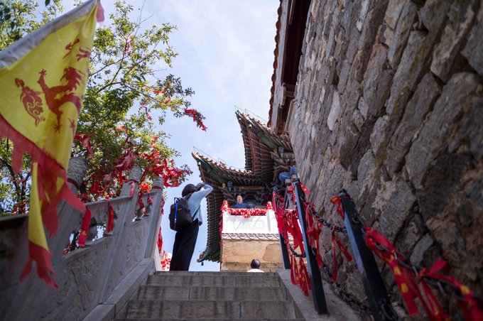休息整顿后,继续沿梯阶而上,这段梯阶明显要陡很多,随着步伐,祖师殿建筑也越来越大,恍若屹立于天地之间。