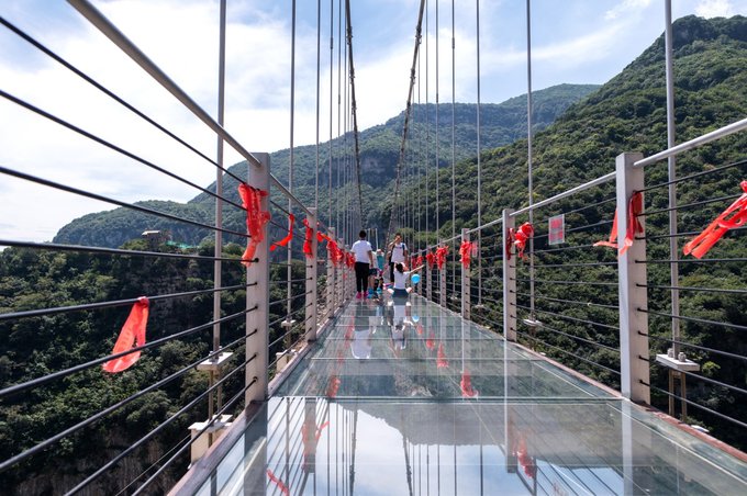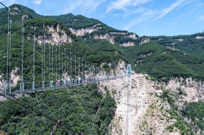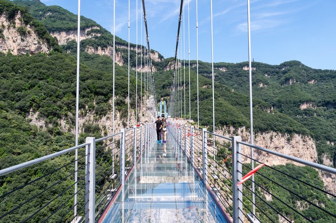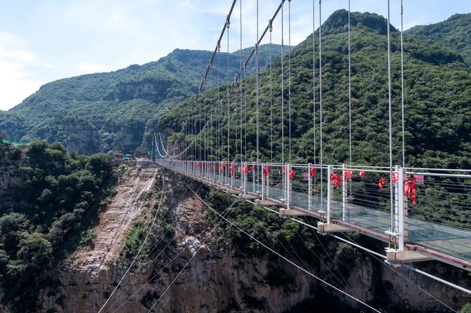 与悬崖秋千相临的便是云丘山玻璃桥,全长219米,高195米,宽度约为2米,耗资数千万,是山西首座玻璃桥。整个桥体采用经过特殊处理的三层钢化夹胶玻璃,可以说非常的安全。现在很多景区都开始建立玻璃栈道,且一个一个险,一个比一个刺激,这座玻璃桥的建立,相信对于山西人民来说就不需要去其他地方体验了。