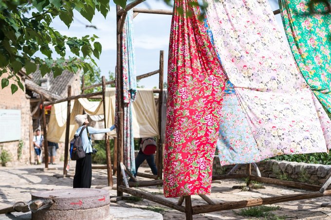 当地人家晾晒的布匹,有没有回忆起小时候盖过的棉被,反正我小时候盖过的棉被花色就是这样子的,现在看看一点不觉得土,反而觉得很有味道。