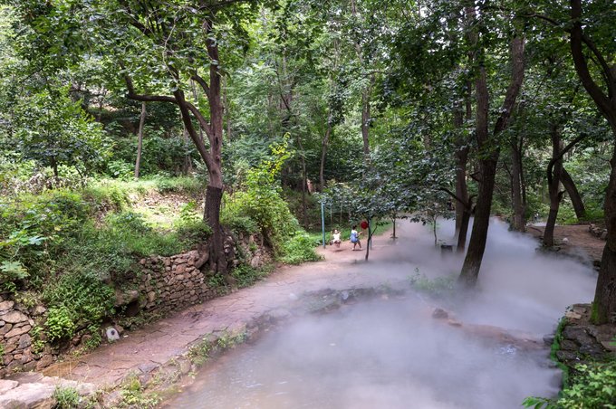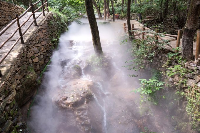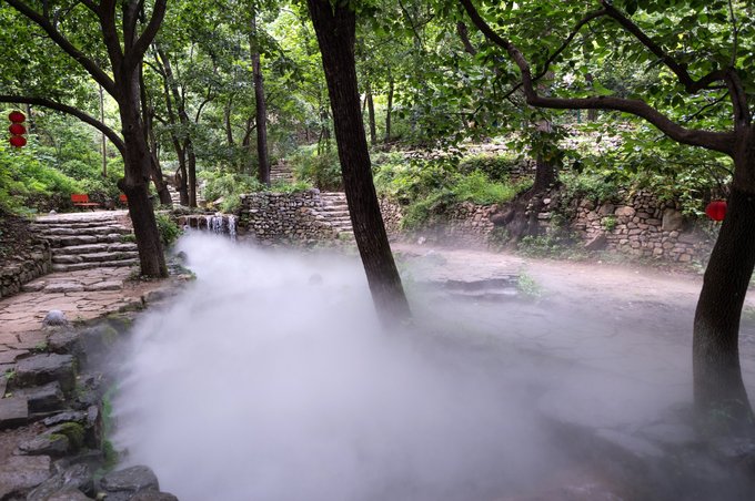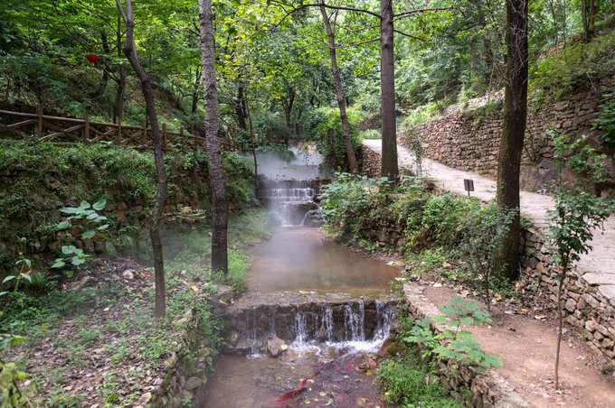 神仙峪里,全植被覆盖,大多以柿子树为主,环境非常优美。后期,在这里人为制作了人造水雾,雾气缭绕,身临其境,如临仙境。空气也是格外的新鲜,富含有益于身体健康的负氧离子。