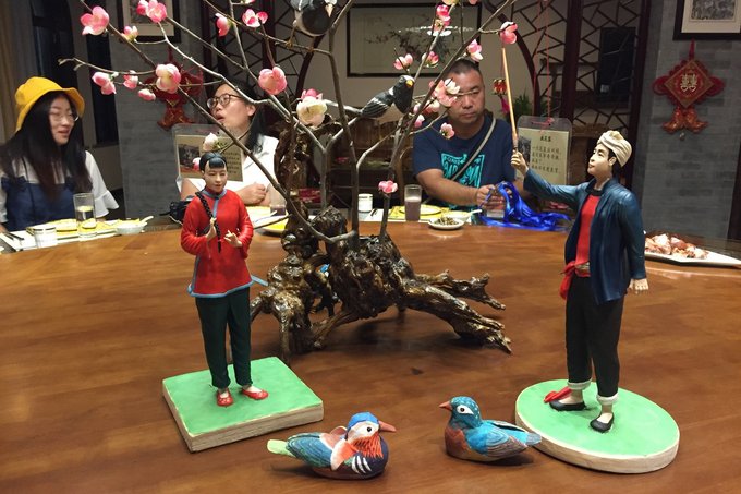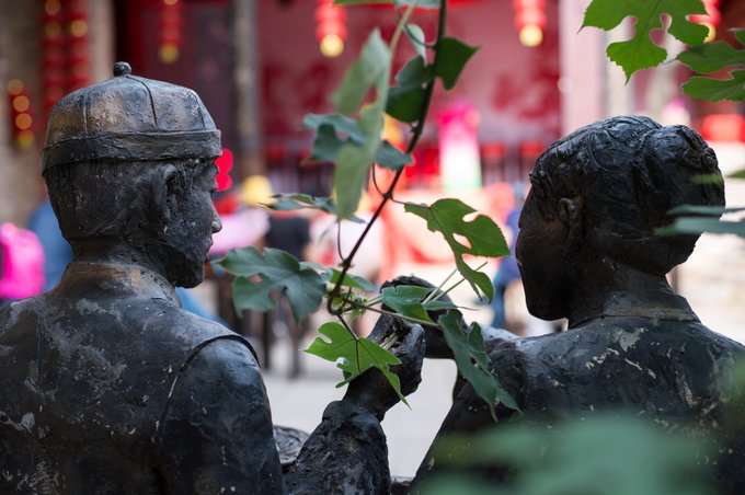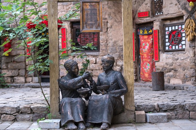 院落内还有两座雕塑,新郎新娘在互喂面条,面容洋溢着幸福的微笑,这是赤裸裸的秀恩爱啊!