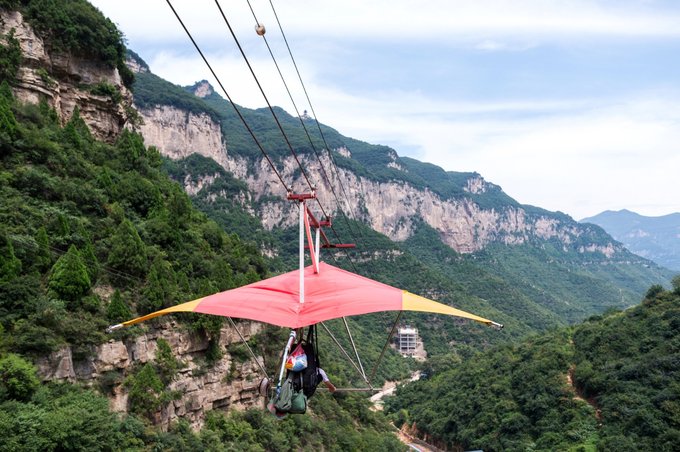 走完玻璃桥,还有华北地区第一条索道滑翔翼等待挑战,说是挑战其实我觉得用体验最合适,因为全程下来我完全没有感觉到一丝害怕,倒有点像鸟儿一样自由翱翔的感觉,哈哈。