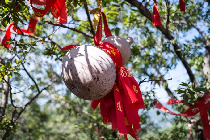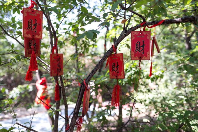 山道见的树枝上悬挂的“财”牌,祈福求慰。