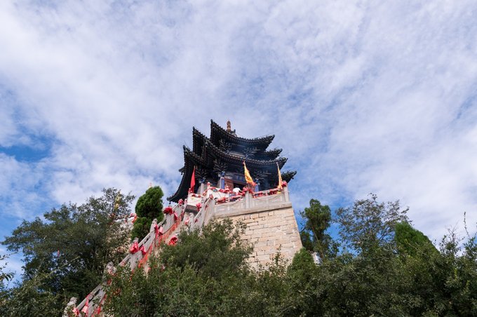 第三层为玉皇阁,现在我们看到的是修复重建后的模样,因抗战时期被日寇炸毁。玉皇阁长6.4米,宽6.32米,高15米,是一座重檐十字歇山顶的阁楼,从下往上看,飞檐翘角,风铃随风摆动,悦耳动听。