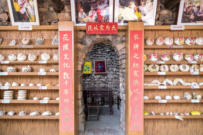 还有一处稍微简单一些的花馍展示墙及一副对联。 上联:农耕之处发源地五谷丰登,下联:花馍文化数千名琳琅满目,横批:民以食为天。表明了花馍的艺术价值及食用价值。