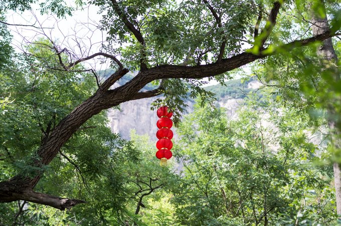 古槐树上悬挂的一串红灯笼,随风飘摆,非常好看。 据说,槐树容易招鬼,挂还是那个红灯笼可以起到辟邪的作用。