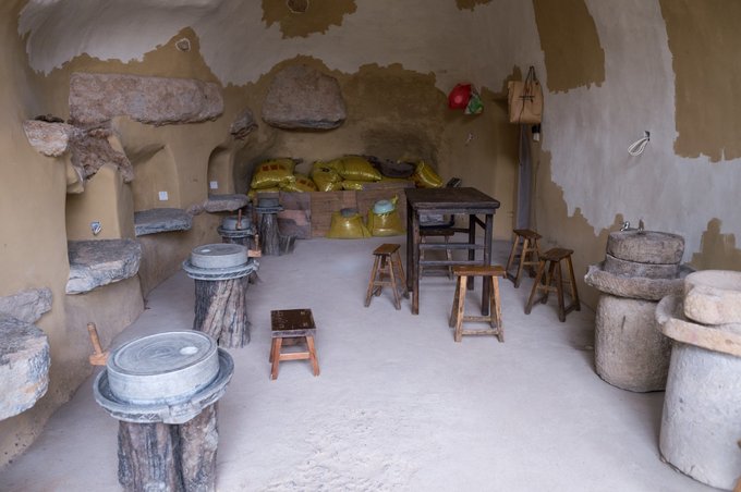 后来,来到了塔尔坡村长家,只是这里已经不住人了,成为了一处展示塔尔坡古村民风民俗的地方,可以理解为村落中的一座小型博物馆。 房间内陈列了村长家的家具、农具、用具及一些手工艺品,都是之前所保存下来的,间接反映那个时代的产物,非常具有纪念及考究价值。院落内还有一些茶桌座椅,走累了可以在这里休息下。