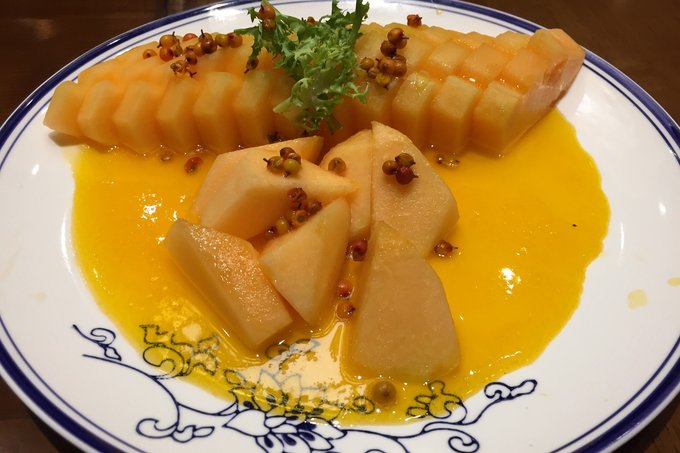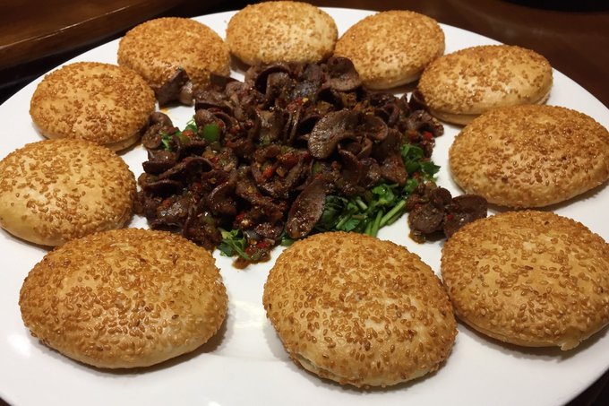 这里大多数的菜的名字我并没有记住,所以只分享我所尝到的味道。 这是一道烧饼与腰子组合而成的菜,烤制而出的金黄色烧饼,中间再加一点儿腰子,咬起来外酥里嫩,香喷喷的,不仅好吃,还可以起到一定的身体保健功效。