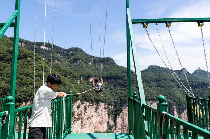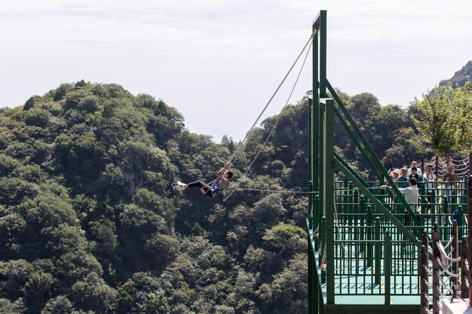 下山要比上山更刺激,因为会有许多惊险刺激的游乐项目等着我们。 首先是悬崖秋千,整个悬崖秋千距离地面高200多米,人坐在上面,待系好安全绳,在工作人员的牵引下,越荡越高,身体不时会感觉飞向山崖之中,如果没有一定的勇气是不敢挑战的。