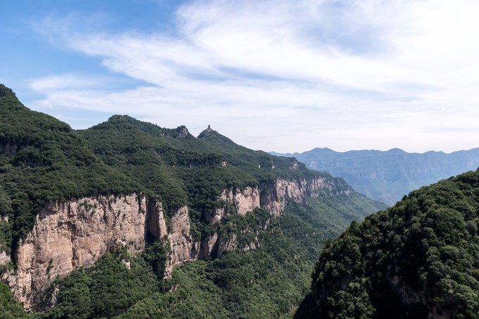 沿阶梯而下的途中,可以看到姑射秀峰,云丘山素有素有“姑射最秀峰巅”的美誉。这座山峰近乎垂直,比较突兀,在其峰顶有五星红旗迎风飘展,游客是无法到这里的。