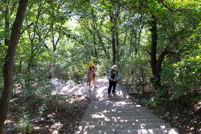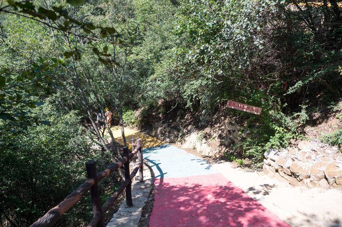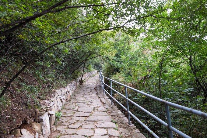 下缆车后,需要走大约30分钟的山间梯道。 哪怕大晴天也不怕,这里林木葱郁,大部分走的都是林荫道。 不过,由于自然环境原生态,山间野物比较多,行走时需要多注意下。