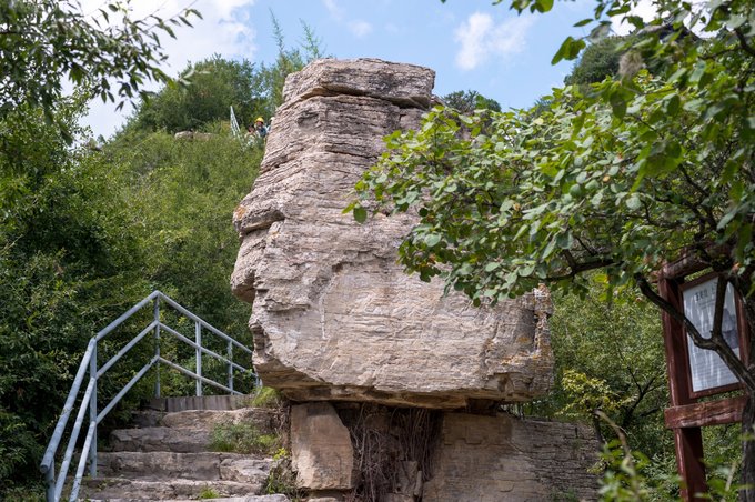 途中也会看到许多石头下面支撑有许多枝条,这是一种爬山的习俗,说是腰疼的人折一根树枝架在石头下腰就不疼了,现在演变为一种祈福方式,于是,赶紧找了一支树枝竖于石头下。