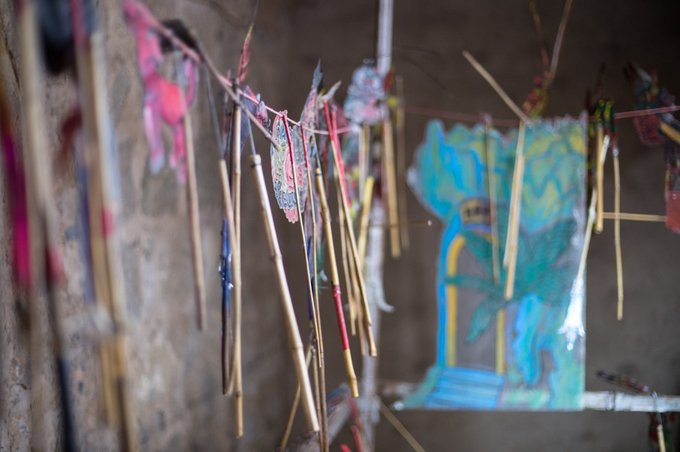 我的童年并没有皮影戏,只是在荧幕上看到过类似的表演,所以不仅对幕前感兴趣,幕后的神秘也一直吸引着我。征的许可后来到幕后操作台,看着师傅们正手拿皮影演绎着,身后也悬挂有不同形象的皮影。看似简单的操作,如果真要你来操作却发现异常困难,不知所措。