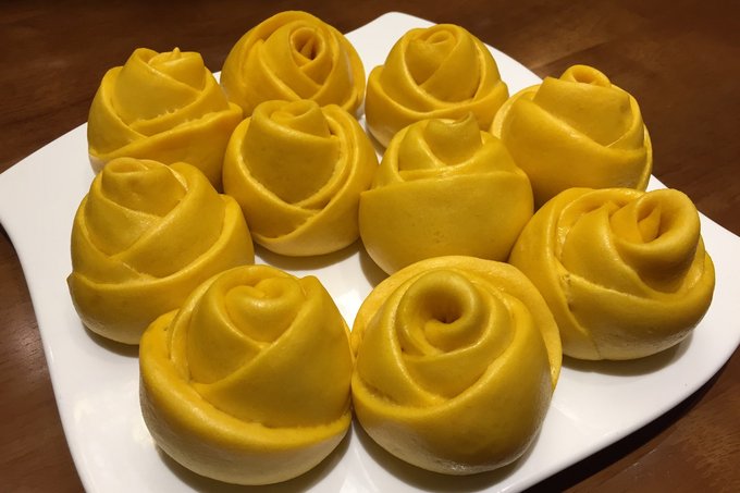 记得这道叫花开富贵,是由南瓜汁做成的面制作而成的形状像花一样的馍馍,山西人爱吃面食,也爱做花样花哨的馍馍。