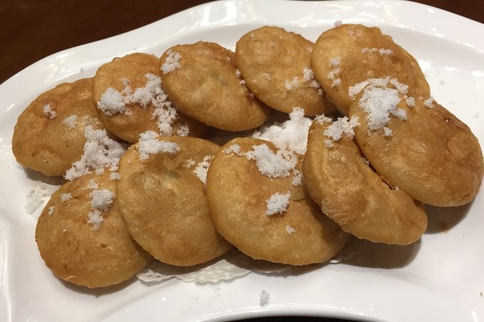 这在我的家乡叫糖糕,一种面食,里面包有糖料,吃起来软软黏黏甜甜的,小时候最爱吃了。