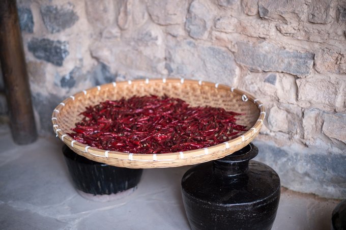 说起塔尔坡的特产,当地的辣椒可是小有名气。依靠云丘山肥沃未受污染的土壤及神泉水的灌溉,这里种出来的辣椒醇香味正,吃起来香辣爽口。当地人非常爱吃辣椒,一来可以驱寒,二来对身体也有益处。在院落内可以看到有碾槽,可以观看制作辣椒面的过程,也可以亲自体验整个制作过程。