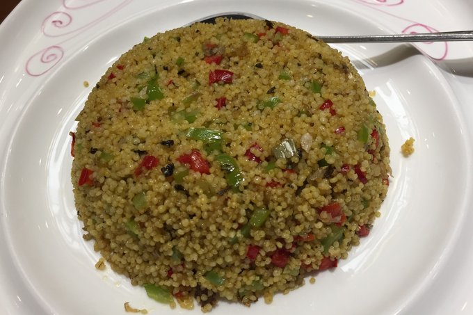 这道菜有个很好听的名字,叫小白菜爱上小皇帝,很奇怪也很好听的名字,本以为里面会有白菜,却发现并没有。主原料为小米,参杂有一些辣椒,还真是第一次吃小米炒饭,吃起来很嫩,很香。