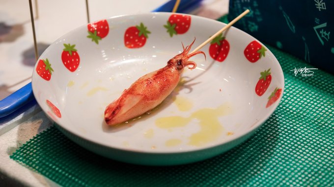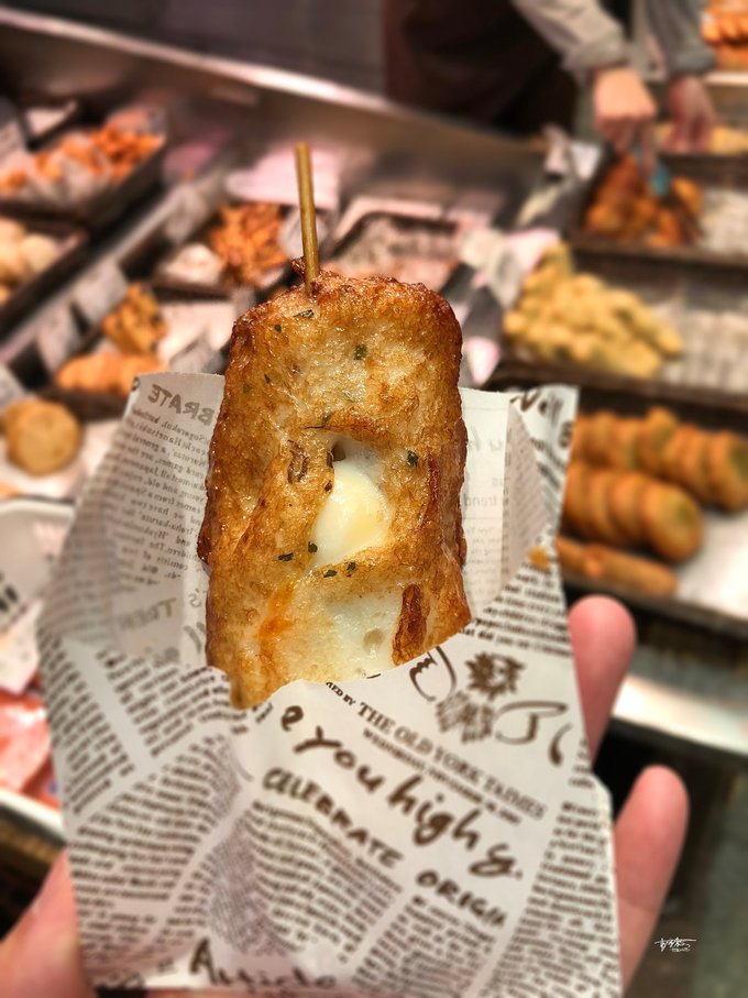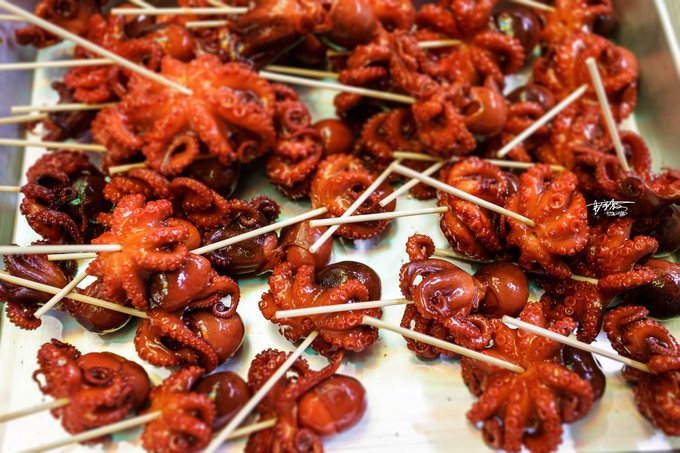 超Q可爱的小章鱼串、喷枪式烤小鱿鱼、抹茶小丸子、鱼丸烤蛋……还有烤面包夹着类似热干面的东西,撒上芝士的奇特组合,虽然看似奇怪,吃起来味道还是不错的。