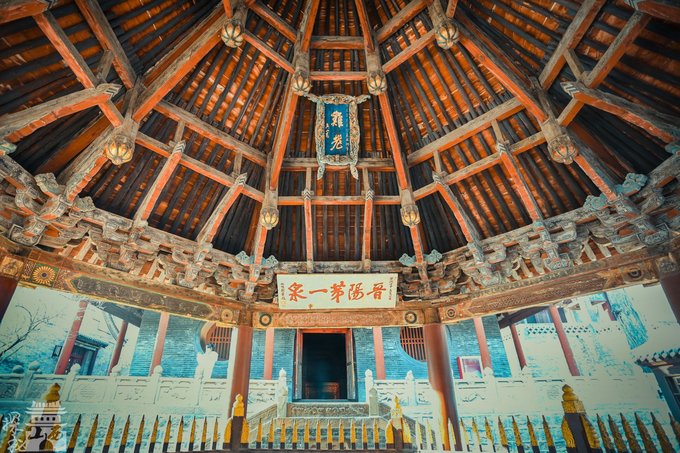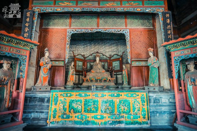 穿过对越坊,我们来到了献殿内。献殿是供奉祭品的场所,建于金大定八年(1168年)。献殿面宽三间,深两间。梁架很有特色,只在四椽栿上放一层平梁,既简单省料,又轻巧坚固。殿的四周除中间前后辟门外,均筑坚厚的槛墙,形如一座凉亭,灵巧而豪放。 献殿整个建筑都是榫卯结构,没有用一根铁钉。现在的献殿是在1995年时按原式样翻修的,保持了金代建筑的特点,是我国古代建筑中的瑰宝。