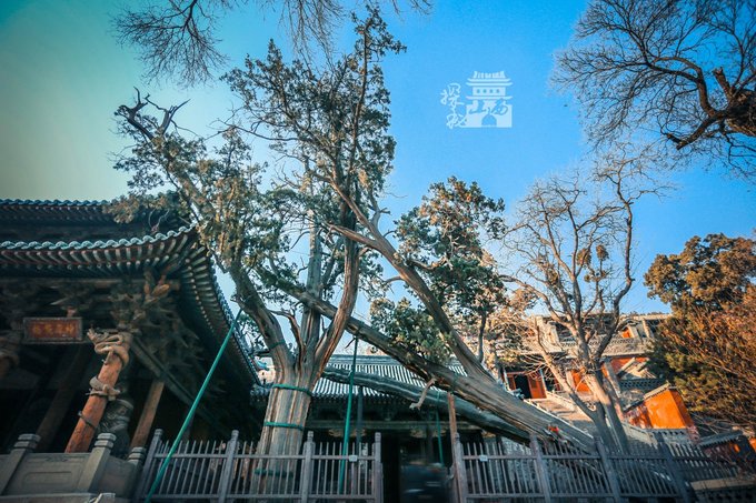 周柏唐槐,二者都是晋祠千年古木的代表。周柏是周代种植的柏树,茂盛葱郁,位于圣母殿北侧。原先本有两株,名为齐年古柏,如今只剩这一株。唐槐是唐代时种植的槐树,位于水镜台前,是晋祠古树中最繁茂的一株。每到春夏之季,树绿荫浓。周柏唐槐树干粗壮,需数人才能合围。