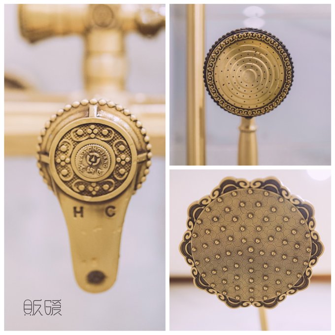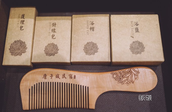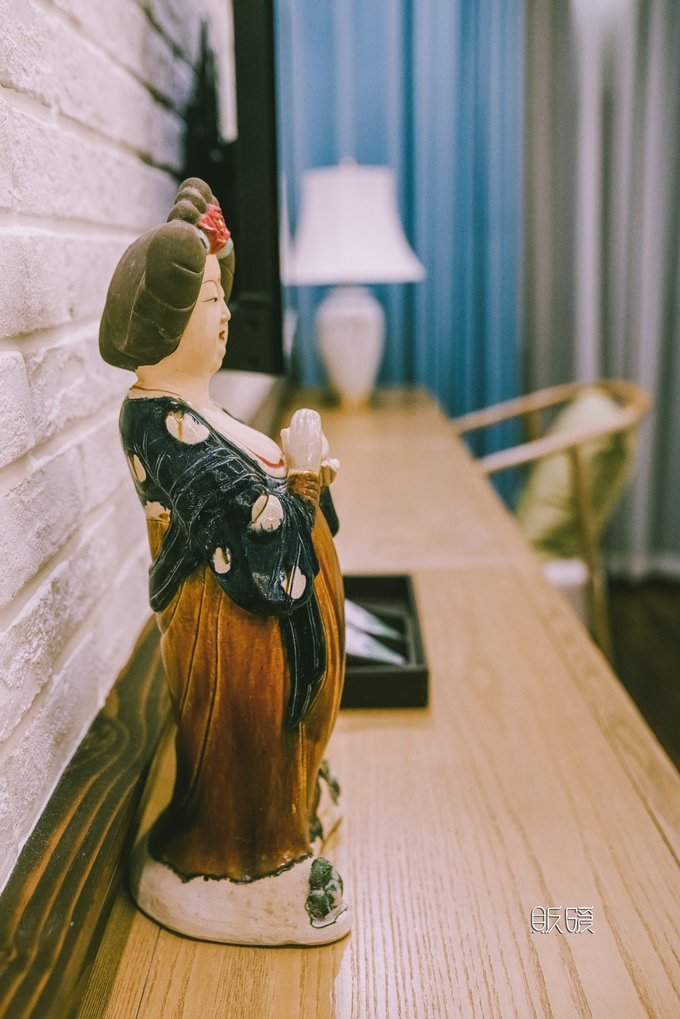 床头的莲花壁画, 唐式女子的雕塑摆设, 牛皮纸包装印有莲花图案的洗漱日用品, 精油草本配方的洗浴洗护, 甚至你在洗澡拿起淋蒙头时都会感叹, 那些五金用料的纯铜材质真的是很有质感和份量。