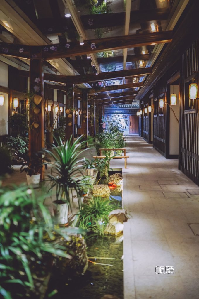 身着唐装的服务员小姐姐热情的接过我的行李箱, 将我们送到位于后院的客房。 从前台走过去还有点距离呢, 外面还看不大出, 走进来才发觉里面真倒是别有洞天。 尤其晚上各个廊道和角落的灯都亮了起来显得更有画意。 而且仔细观察会发觉, 这里大部分的建筑都都是采用了木质的结构, 可又不失线条美, 细节处处流露着巧妙心思。