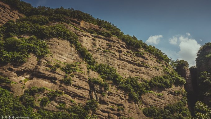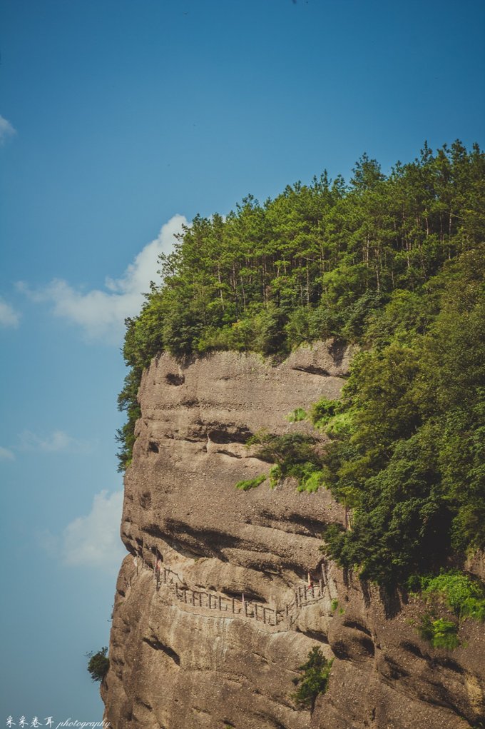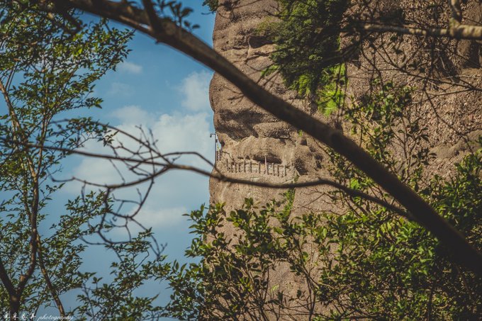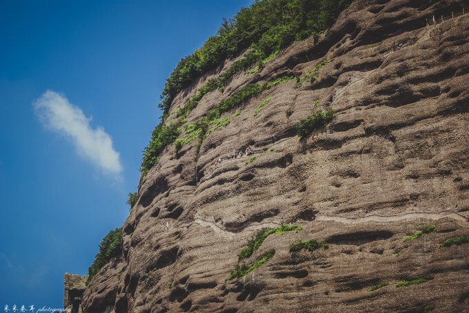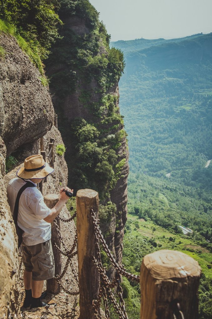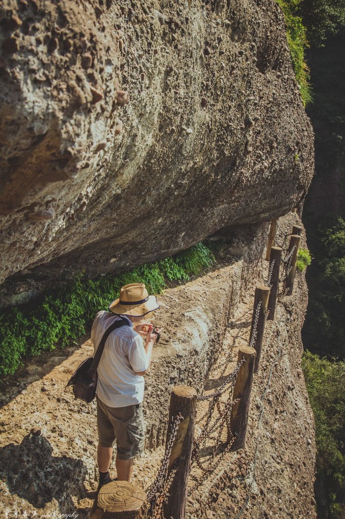 用动图来纪念老爸和我的登顶一刻。(同程不支持GIF) 只见我们一人挂个单反、然后揣个摄像机登山,路人无不啧啧称奇 而且,这么窄的山路居然有人从反向攀登,也就是说,还会有错车的场景出现!以前看游记和攻略都说鸟道是单向的,但不知道是不是我们去的那天游客不多,所以景区根本没管,差评!有些路段错车还是比较危险,建议大家游玩时互相 礼让 ,尽量退到开阔的地方再说。