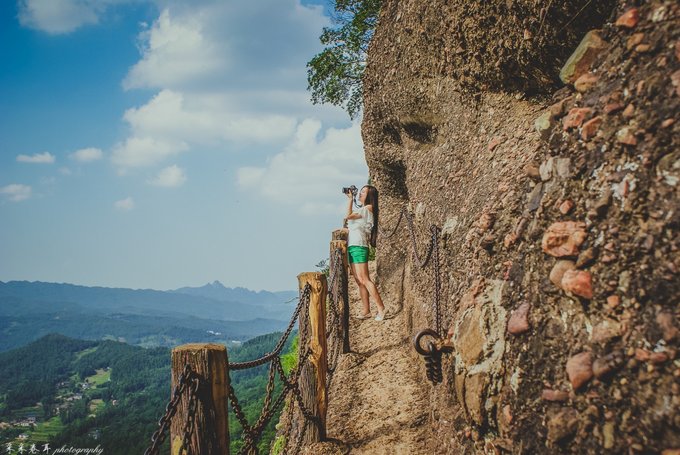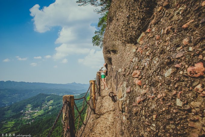 道路逶迤难行,不知过了多久,终于到达山顶。谁知前路更加难行, 巨石之下,险崖之上,一条羊肠小径若隐若现、似断非连。 或侧身、或弯腰、或蹲下、或用手扶绝壁。 那一刻,我才总算亲身体验了蜀道之难!
