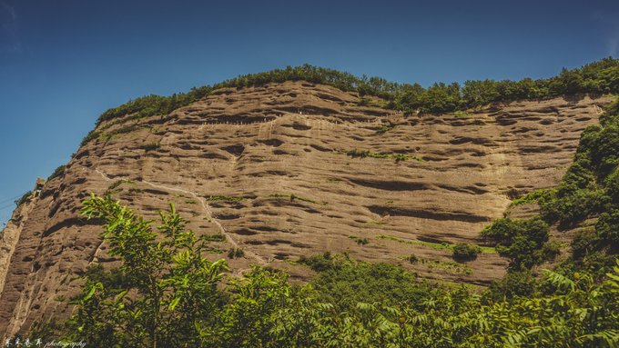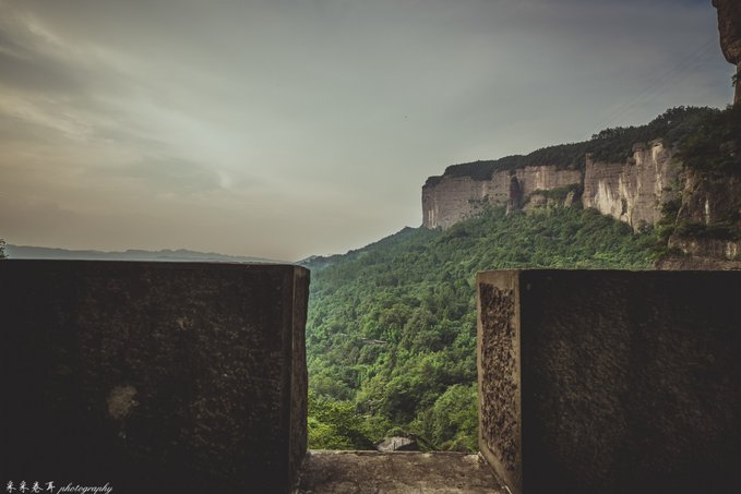 ↑ 猿猱道全景。“猿猱”二字来源于李白《蜀道难》一诗中的“黄鹤之飞尚不得过,猿猱欲度愁攀援”。 猱,náo,古书上指的一种猿猴。