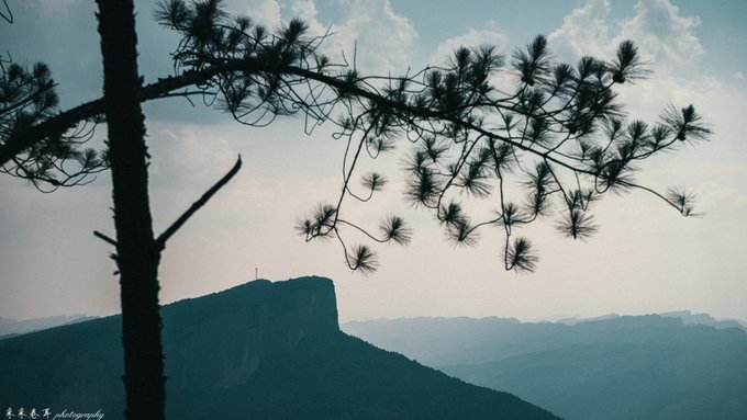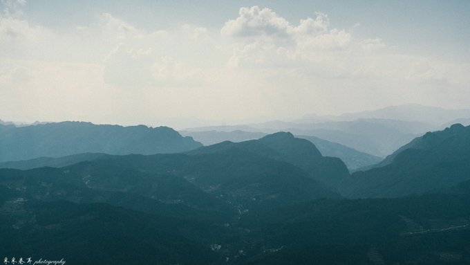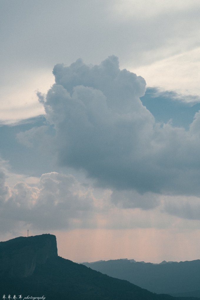 在碰了好几次头后,我们穿越了黑暗中略狭窄的洞穴,瞬间被眼前开阔的山景吸引。此时天色渐晚,不知从什么地方飘来的白云汇集在一起,暂时遮蔽了阳光。但见远山如黛绵延未绝、苍松陡峰间氤氲迷离、霞光上云朵变幻,竟分不清那白雾究竟由天地间何处生出。而环绕其间的历史早已在青山白云深处,渐行渐远。