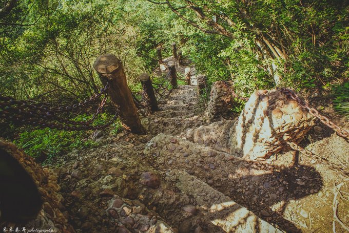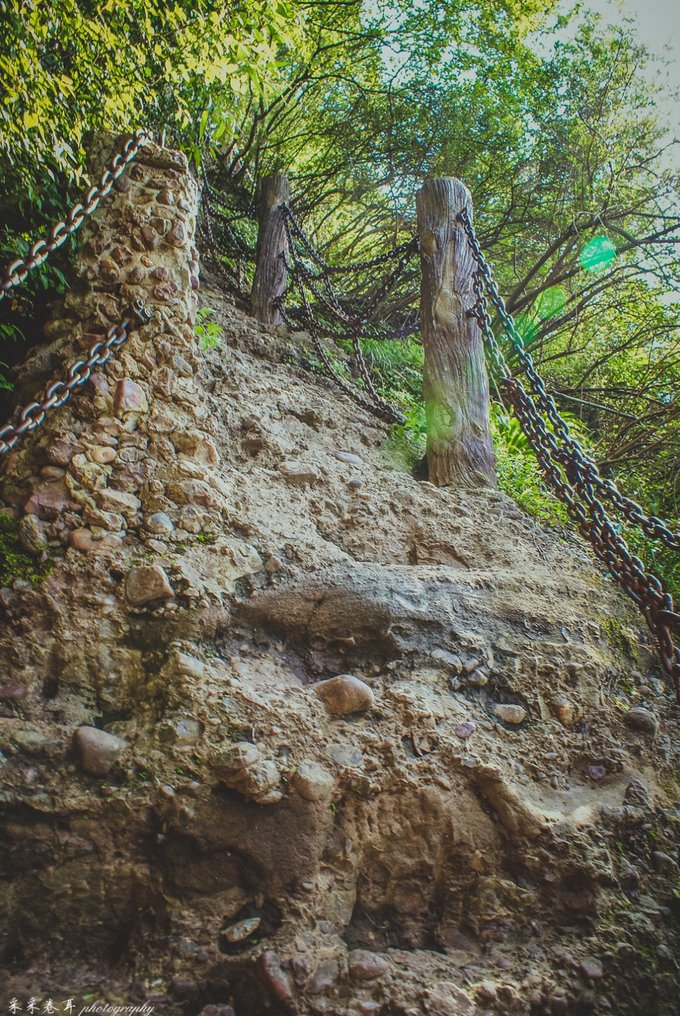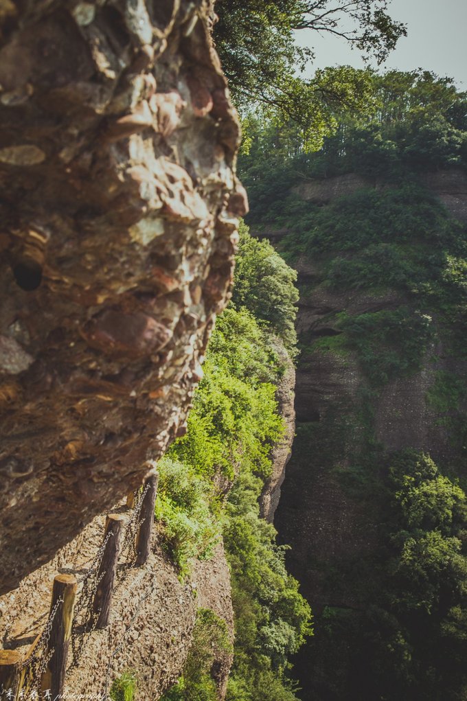 [体验鸟道.危险与欢乐并存] 来到一号观景平台,我们一家人合计,妈妈(本来也想和我们一块儿探险,无奈穿了一双高跟鞋 )和某狗先生(恐高症老公 )带小葵(我们家八岁的博美狗狗)直接坐二号索道去山顶。 爸爸和我去攀登鸟道。之所以没有选择猿猱道,是因为考虑到老爸六十多岁了,有一定风险。其实他本人倒是跃跃欲试的,虽然后来还是决定放弃,但应该为他不惧年龄,敢于探险的精神点赞。 其实鸟道的攀登刺激程度不亚于猿猱道,有直上直下的地方;还有仅一边铁索的险梯。 抬头仰望前路,只见:怪石丛生疑无路,密林遮蔽不知向。 回首俯瞰来路,又见:满目青翠里,蜿蜒险道生。