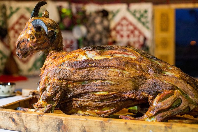 新疆最著名的美食当属烤全羊,没有之一,烤全羊,而这次的烤羊尤为特别,烤法也不同,师傅们先用独特的手法将羊处理好,烤的时候把一种秘制的酱汁涂在羊身上面,然后放在馕坑里面满满焖烤,和炭烤的还不太一样。焖烤的味道更香浓,更入味。吃着烤羊、喝着啤酒、听着故事,人间值得!