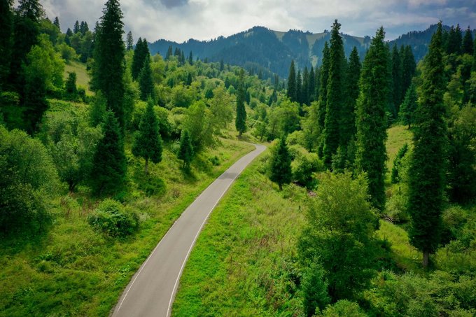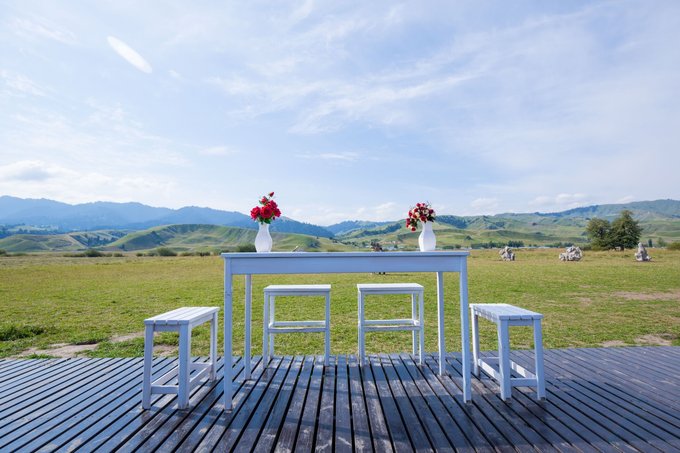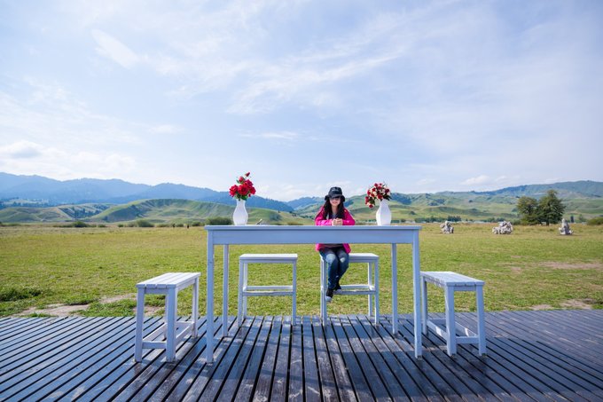 我们首先来到的是塔吾萨尼,塔吾萨尼是哈萨克语,意为“美丽的山沟”,在这个景点您看到雪山、森林、山丘、草甸的完美结合,可谓是一山四景,景景不同。因为自然景观垂直立体,这里也是众多游客朋友旅拍必停的网红打卡点,最最温馨的是,景区还为喜欢拍照的朋友在这里设置了反光板,再也不用担心背光拍不出好照片了。