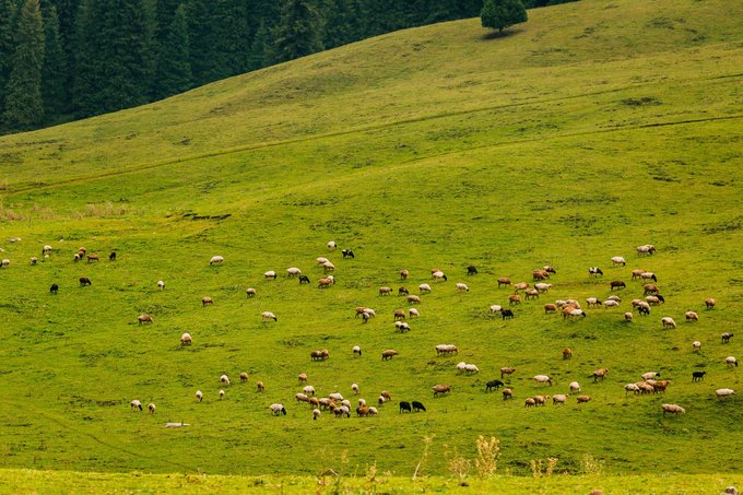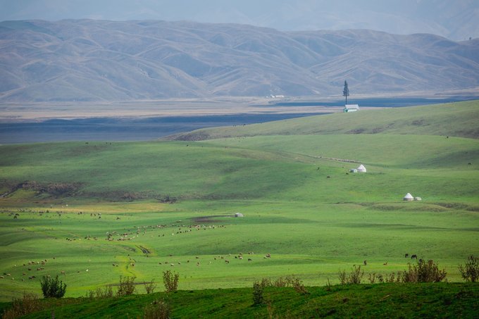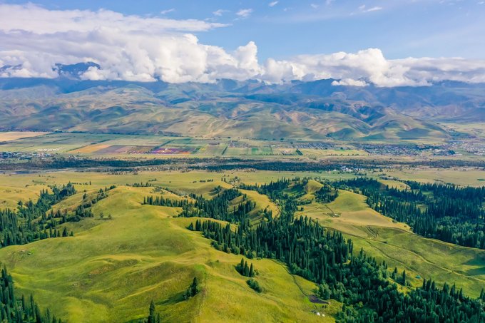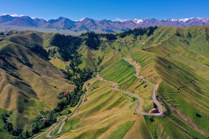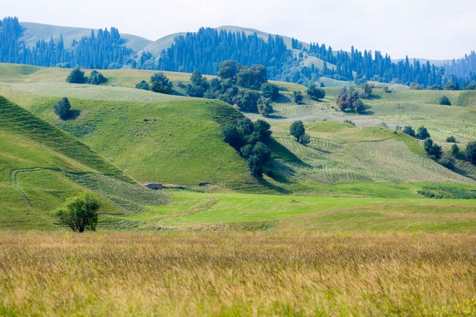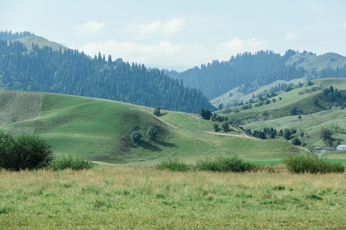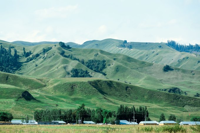 驻足在山顶,凉风习习,眺望远方,在蓝天的映衬下,远处白雪皑皑的山峰,茂密的森林,碧绿的山丘以及一眼望不到头的草原,构成了一幅清新醉人的画卷。 那拉提草原被誉为哈萨克人口最多的草原,当地的哈萨克牧民非常热情,一路上对我们非常照顾,并且教我们如何打草,让我们体验当地的生活。