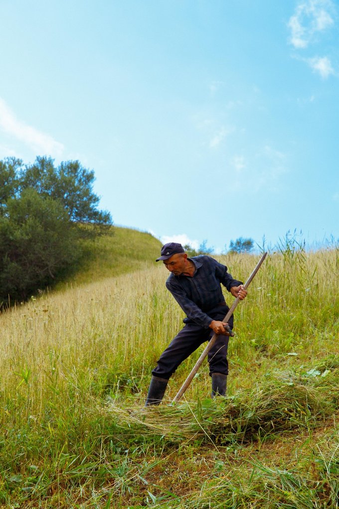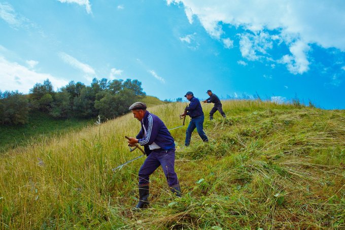 与一些平坦草原地区使用机器打草不一样,这里打草使用的工具是一种特制的大镰刀,完全都是手工操作,打完之后再用马驼下山去,用来冬季喂养马匹和牛羊。