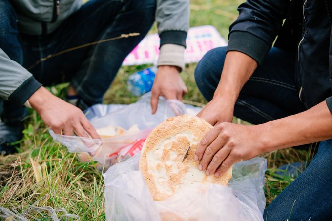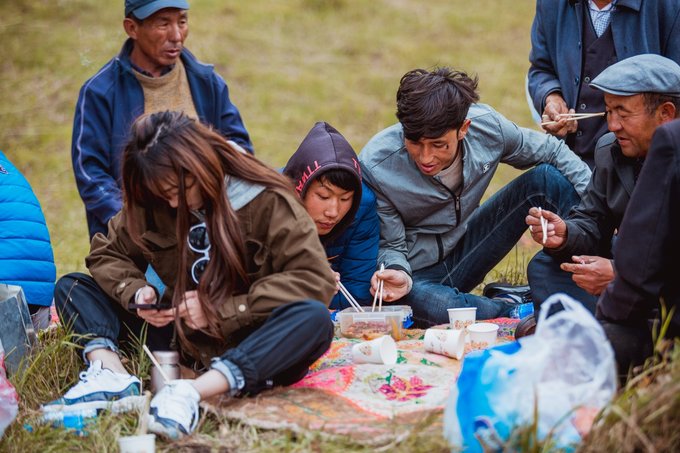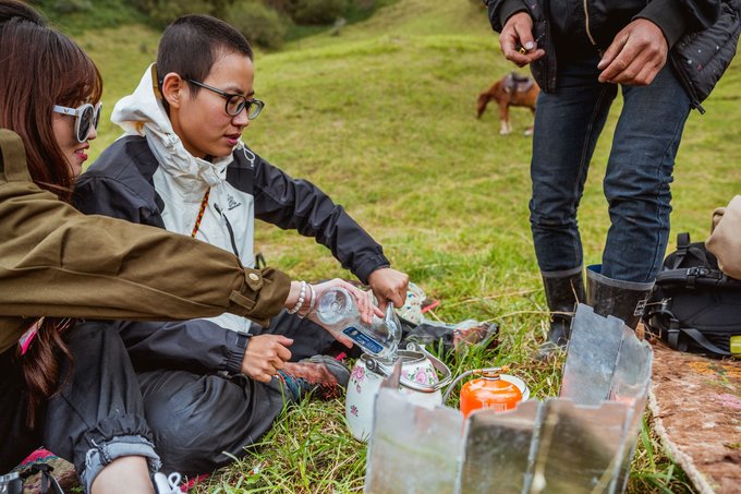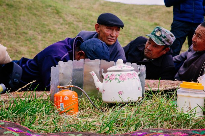 打草结束后,满身的压力都随着打草过程挥散而去。由于山顶秋风比较凉,一定要注意保暖。热情的牧民邀请我们一起熬制奶茶,配上新疆特色的食物馕,恰好可以补充刚刚打草消耗的体力。