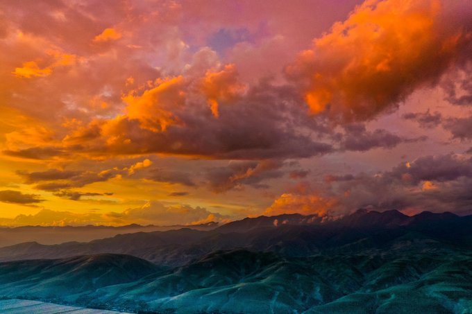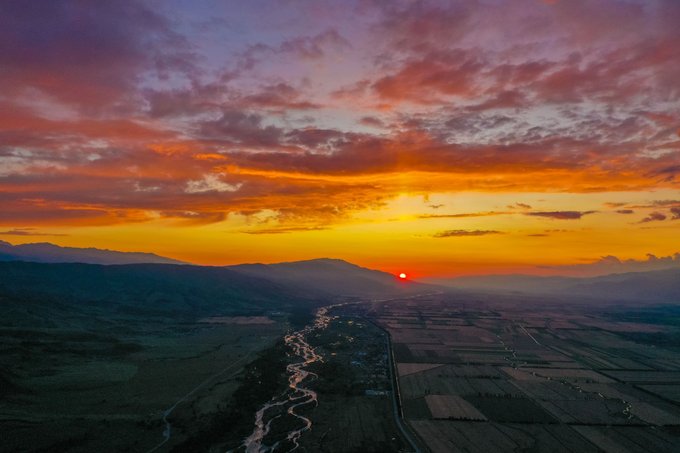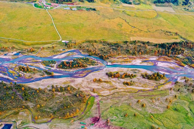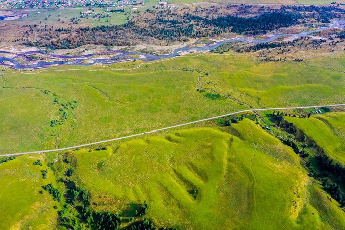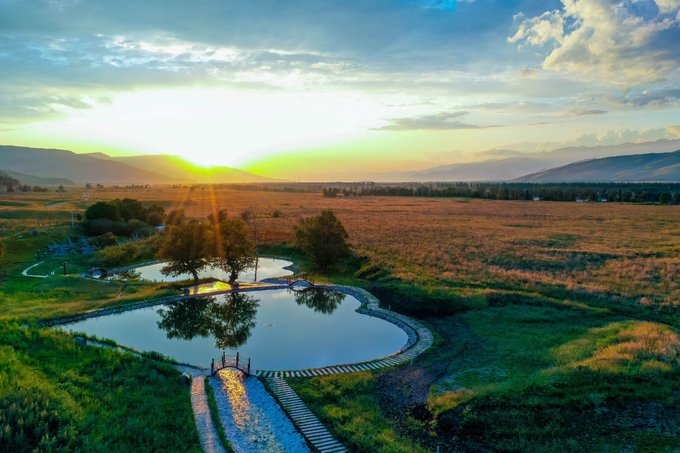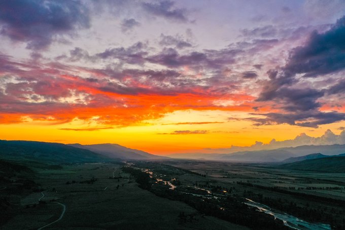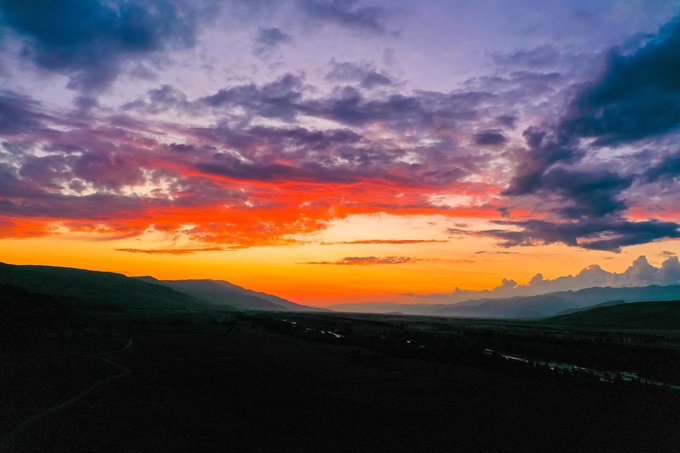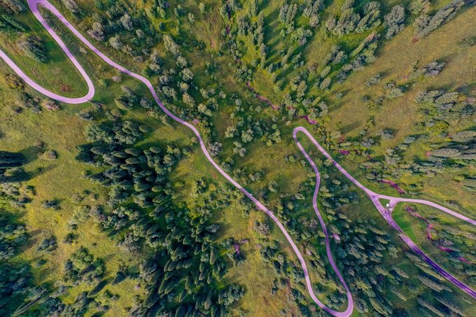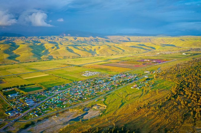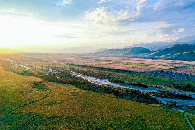 蛟龙出海观景台是盘龙谷的一处山顶坡地,也是盘龙环山道抵达的最高点,天高地远,视野开阔,天风劲俏,空气清泠,走下车来,立马有种豁然开朗的感觉。 凭空远眺,环绕在那拉提草四面八方的群山峰脉,在这里一齐摆开了腾龙阵,杉林密布的那拉提山是青龙,白雪覆盖的天山是白龙,太阳阴影下的低矮山梁是一条条黑龙,沐浴在晨曦晚霞中的东西山脉瞬间化作无数金龙。