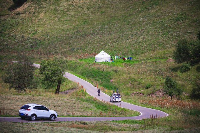 从乌孙古迹结束后,我们前往盘龙谷道西段,这一段景色优美,道路平缓,非常适合骑行。秋季的那拉提景区,静谧的盘龙谷道新增了“4+2”项目。“4+2”指的是四轮加两轮的骑行生活,即观光汽车和自行车的搭配出行。
