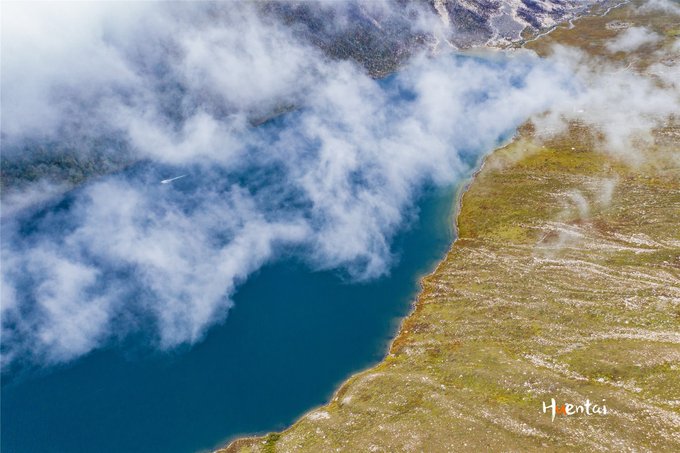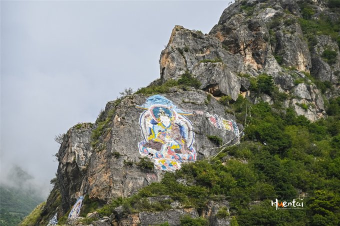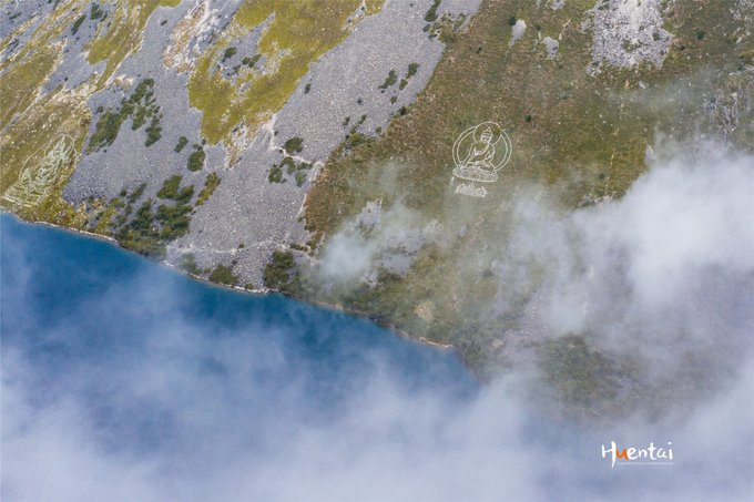 不过在木格措旁还是做了次明智的选择,就是飞无人机。其实看了网上的图片,像我一样爱好航拍的小伙伴一定都会有飞航拍的冲动。用无人机飞了最大限度的500米,终于看到了与湖边不一样的景色。飞机冲破云层,可以俯拍到一些好看的场景。其中一处山壁上还有释迦牟尼的画像。