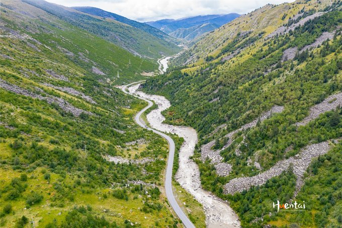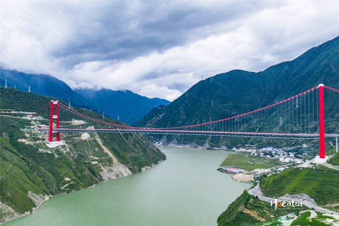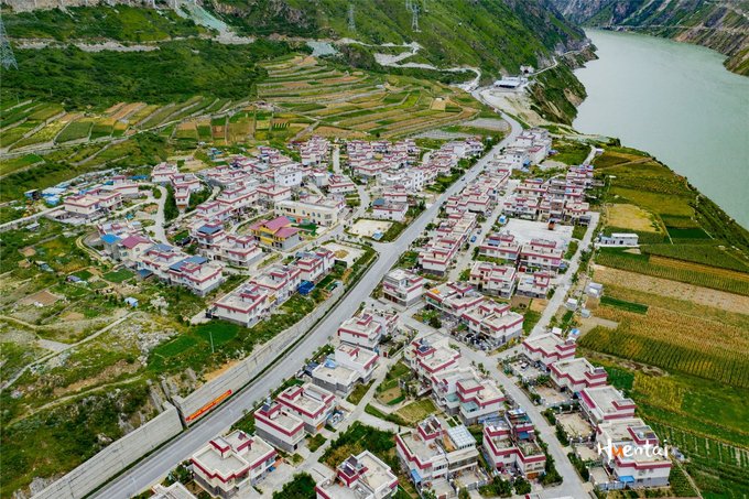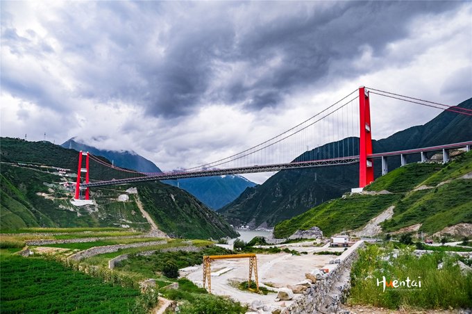在泸定的咱里村还航拍到了号称“川藏第一桥”的泸定大渡河兴康大桥。不知道这个“第一”是怎么评选的,可能是川藏线上桥并不多吧?但是上学课本上的《飞夺泸定桥》至今还记忆犹新,虽然此桥非彼桥,但大渡河还是这条大渡河,看着湍急的河水饮水思源,感慨正是有着前人的“挖井”,才有了后人的美好生活。
