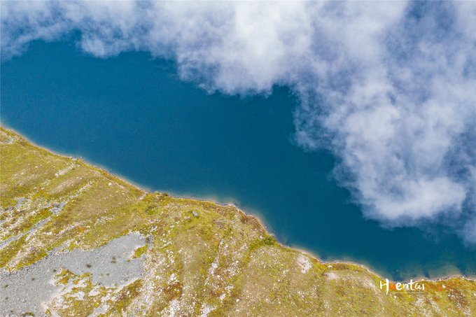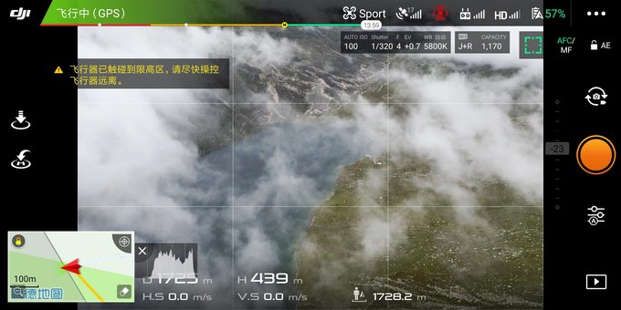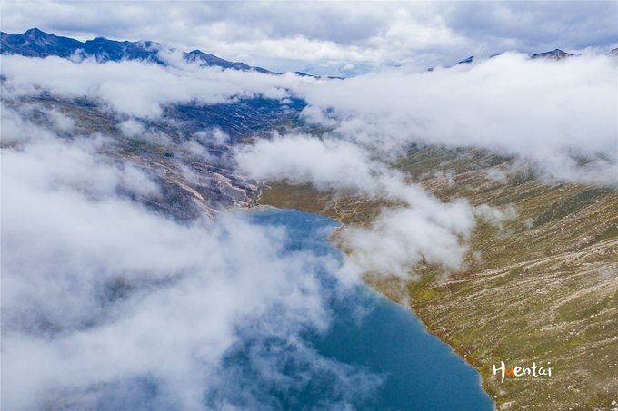 不过对于航拍,木格措也是一处特别有意思的景点。整座湖面的面积很大,我航拍的时候因为一半是很厚的云层,根本看不出它的全部,所以我就拼命的往云少的地方飞,然而木格措居然有一半的区域是处在康定机场的限飞区范围内的。玩航拍的应该都知道,机场限飞区最高是120米高,距离再近的话甚至是无法起飞。相差了380米的高度,拍出的风景也大有不同。这次天气不好,120米拍出来的根本是白茫茫的一片。所以我的飞机时不时的会在限飞区边缘试探,手机不断的提示远离,当然也飞不进去。