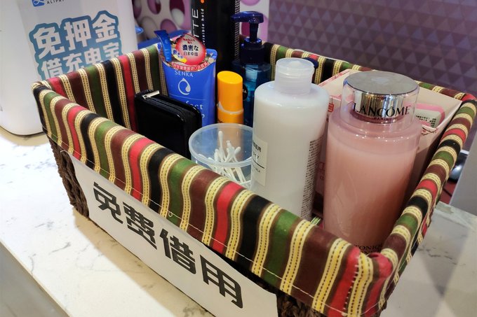 更加神奇的是这家酒店前台居然还免费提供给客人兰蔻粉水,MUJI的润肤,资生堂的洗面奶等等。我想着在城市里也很难看到这样的待遇吧?东西肯定只能借用不能带走的,一间大床房是200块,不然比房价还要贵,哈哈。