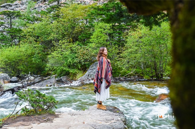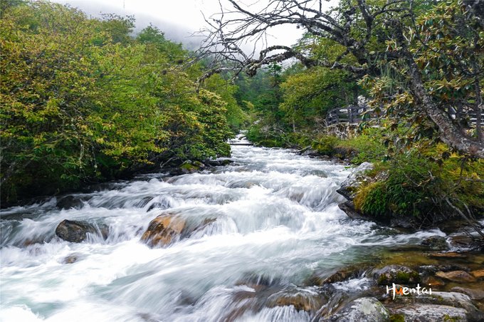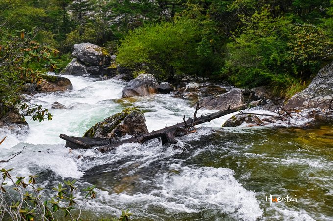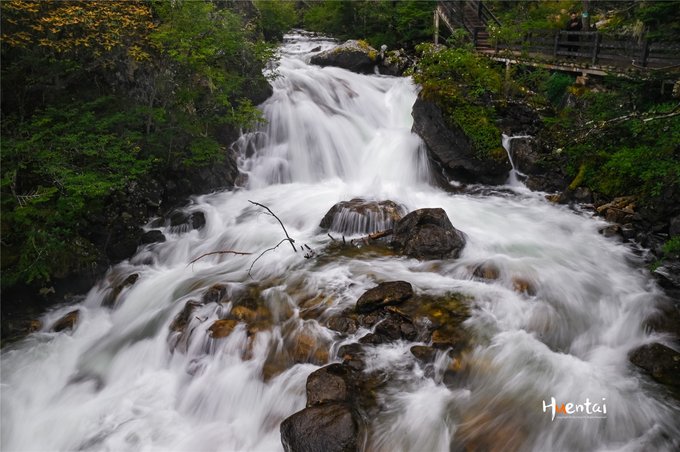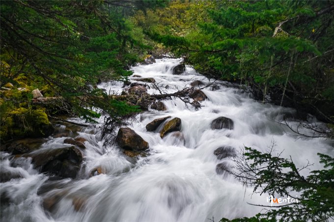 沿着红石滩一直往溪水的下游走可以到达七色海。这一路的风景是很漂亮的。瀑布在山林之间汹涌澎湃,水质看起来特别的好,适合来几张慢门。