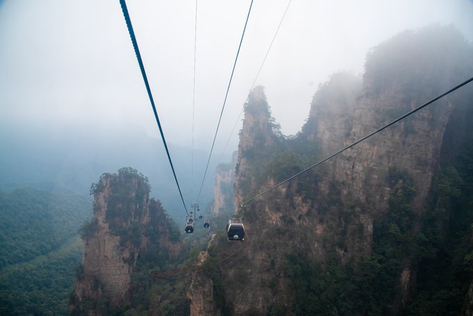 第二天,我们起了个大早,从 武陵源 的入口处做景区的巴士到达索道下口处,再乘坐索道上山。这条索道是游客进入天子山景区的主要交通工具。 随着索道上升到达最高海拔点1262.5米,如果天气好运气好,在这里有机会可以观赏到云雾、月夜、霞日、冬雪四大奇观。