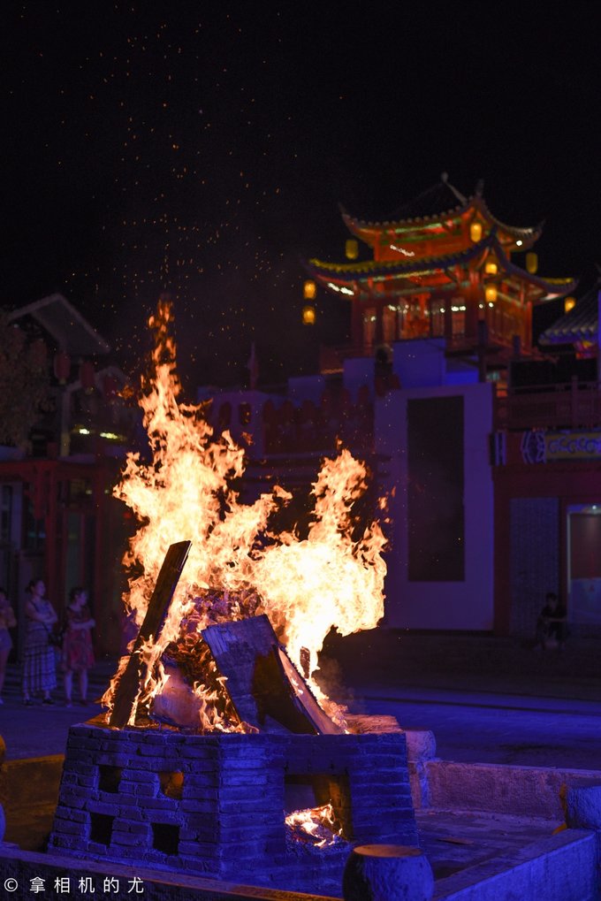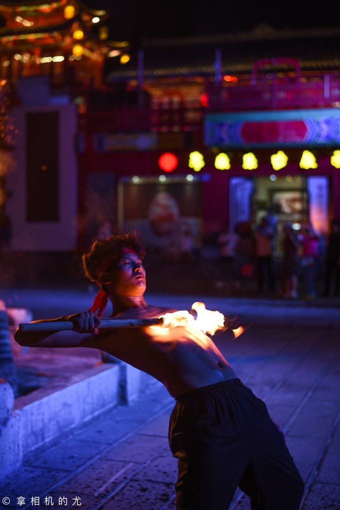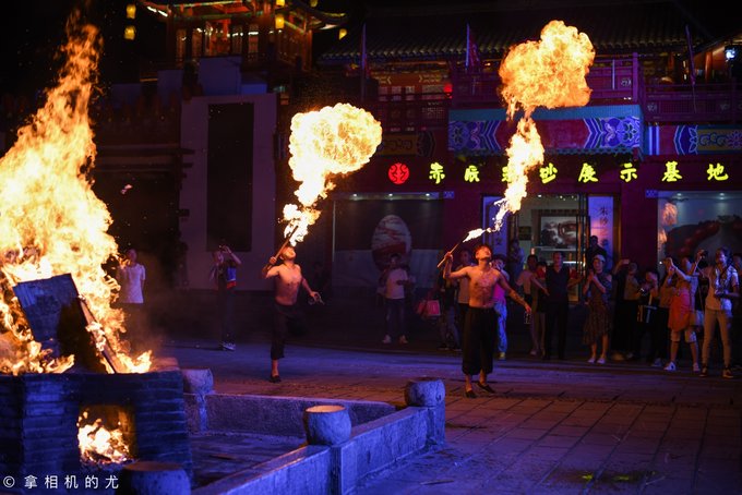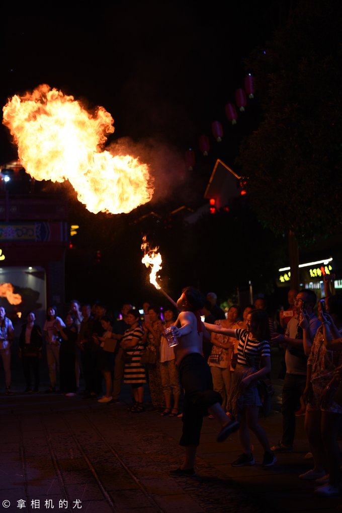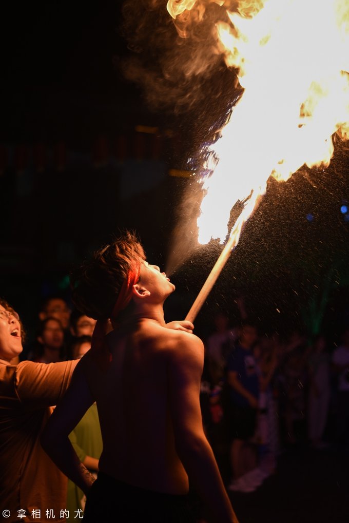 此时,广场上开始了篝火晚会,只见两位玩火的帅哥拿着火棒在自己身上滚来滚去,现场气氛一下子高涨。时而喷火,时而做出各种危险动作,时而拿着火棒与群众互动……除此之外还有花鼓舞、苗族阿妹跳甩手舞等。